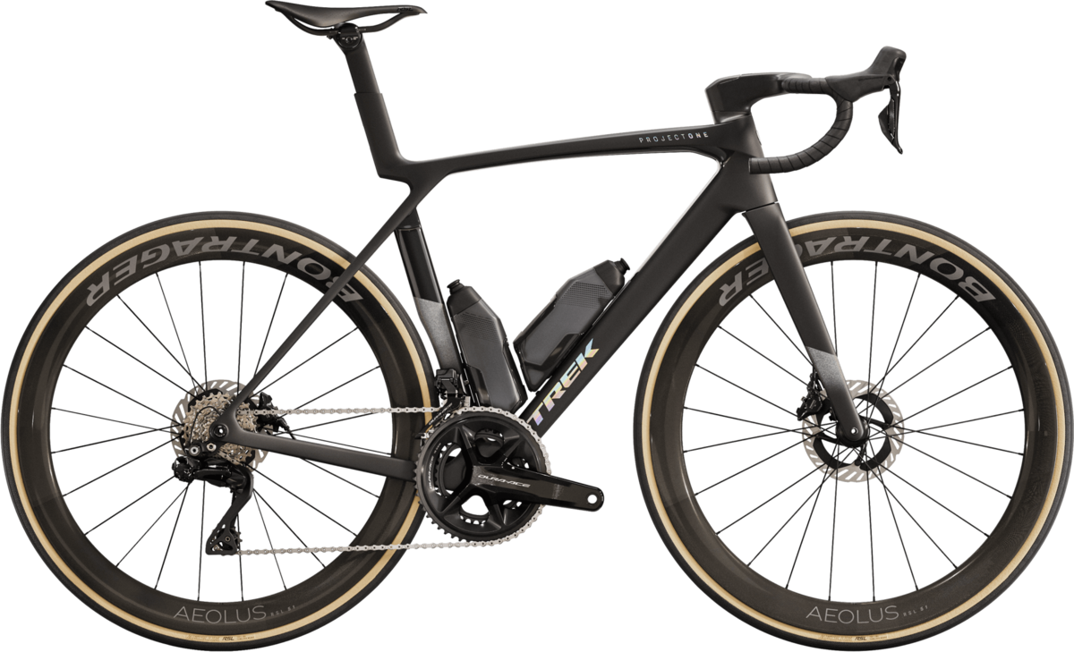 An insanely light frame made of our highest-level 900 Series OCLV Carbon with aero tubing and IsoFlow comfort technology, and RSL Aero Bottles and Cages that save watts. Shimano's top road groupset – Dura-Ace Di2, for lightning-fast shifts that you can customize. A universal derailleur hanger so you can get a replacement anywhere. Plus, it's topped off with Bontrager Aeolus RSL 51 tubeless carbon wheels and a Trek Aero RSL one-piece bar/stem.